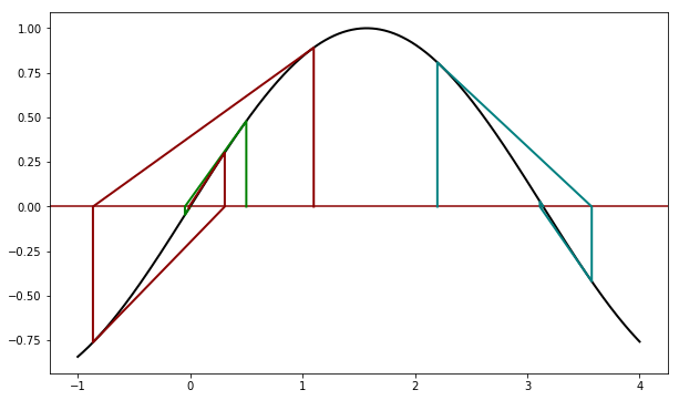 mpl.rcParams['figure.figsize'] = (10,6) def f(x): return sin(x) def df(x): return cos(x) def newton_points(h): # h = [(x0, fx0), (x1, fx1), ...] xvalues = [] yvalues = [] for x, y in h: xvalues.extend([x,x]) yvalues.extend([0,y]) return xvalues,yvalues x = linspace(-1, 4, 1000) y = sin(x) pl.axhline(color='darkred') pl.plot(x,y, color='black', linewidth=2) for x0, color in [(0.5,'green'), (1.1, 'darkred'), (2.2, 'teal')]: x, fx, h = newton(f, df, x0) print('Para x0 = {}, raíz = {:6.3f}'.format(x0, x)) xpoints, ypoints = newton_points(h) pl.plot(xpoints, ypoints, color=color, linewidth=2)