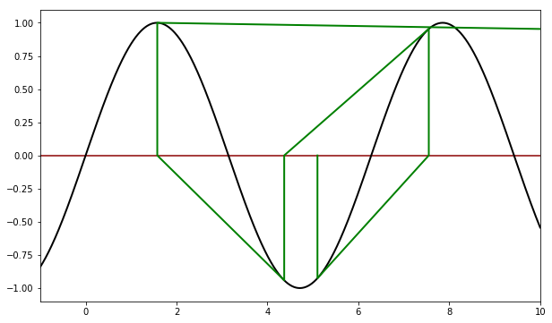 def f(x): return sin(x) def df(x): return cos(x) x = linspace(-1, 10, 1000) y = sin(x) pl.axhline(color='darkred') pl.plot(x,y, color='black', linewidth=2) for x0, color in [(5.1,'green')]: x, fx, h = newton(f, df, x0) print('Para x0 = {}, raíz = {:6.3f}'.format(x0, x)) xpoints, ypoints = newton_points(h) pl.plot(xpoints, ypoints, color=color, linewidth=2) pl.xlim(-1,10)